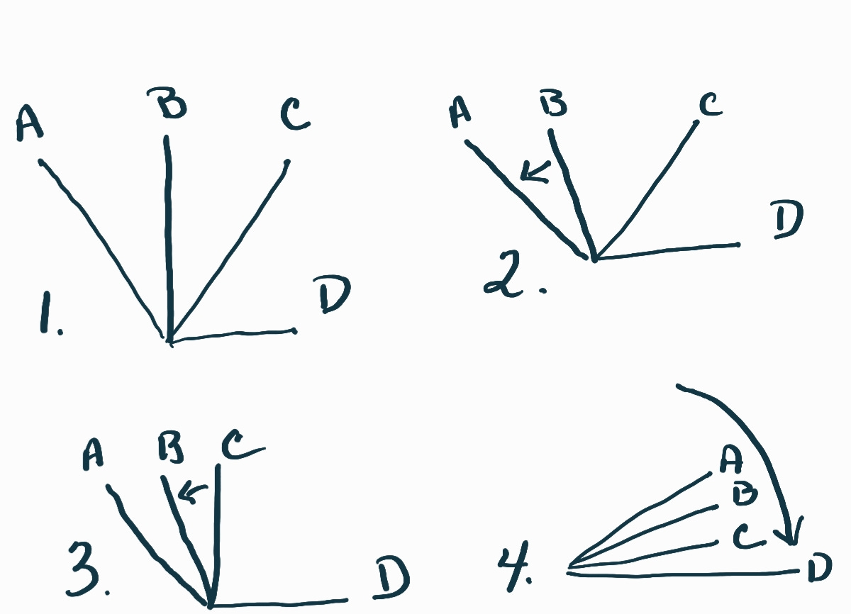 As you can see D is still happily hanging out in rest but it has an idea C may be pulled into B. So it really isn’t resting as it’s busy holding C in place by pulling it back from following B. All the muscles holding bones A,B, C & D are active holding their desired position. Now A needs C to come closer without moving B. So it has to remain strong to keep B in place for B to pull in C. (fig. 3)